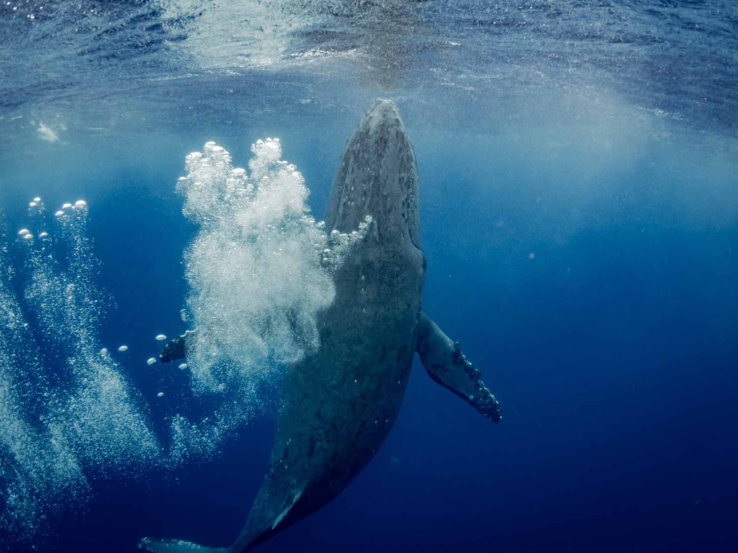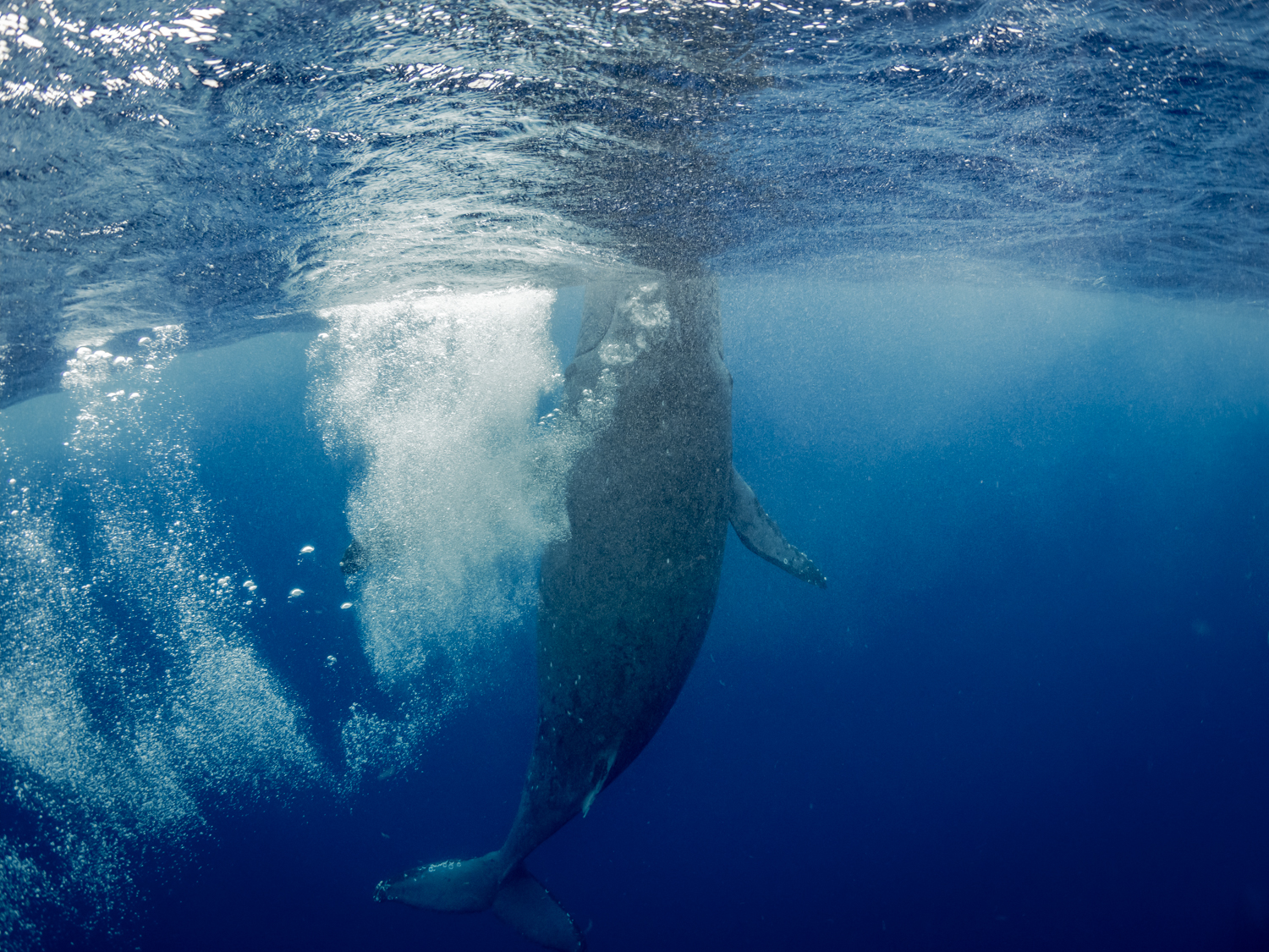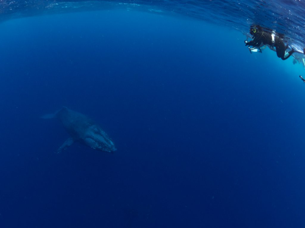 水中ではゆっくり真下を通ったり、泡を吐きながら通ったと思ったら、そのまま近くでスパイホップして、ゆっくり潜っていきました笑