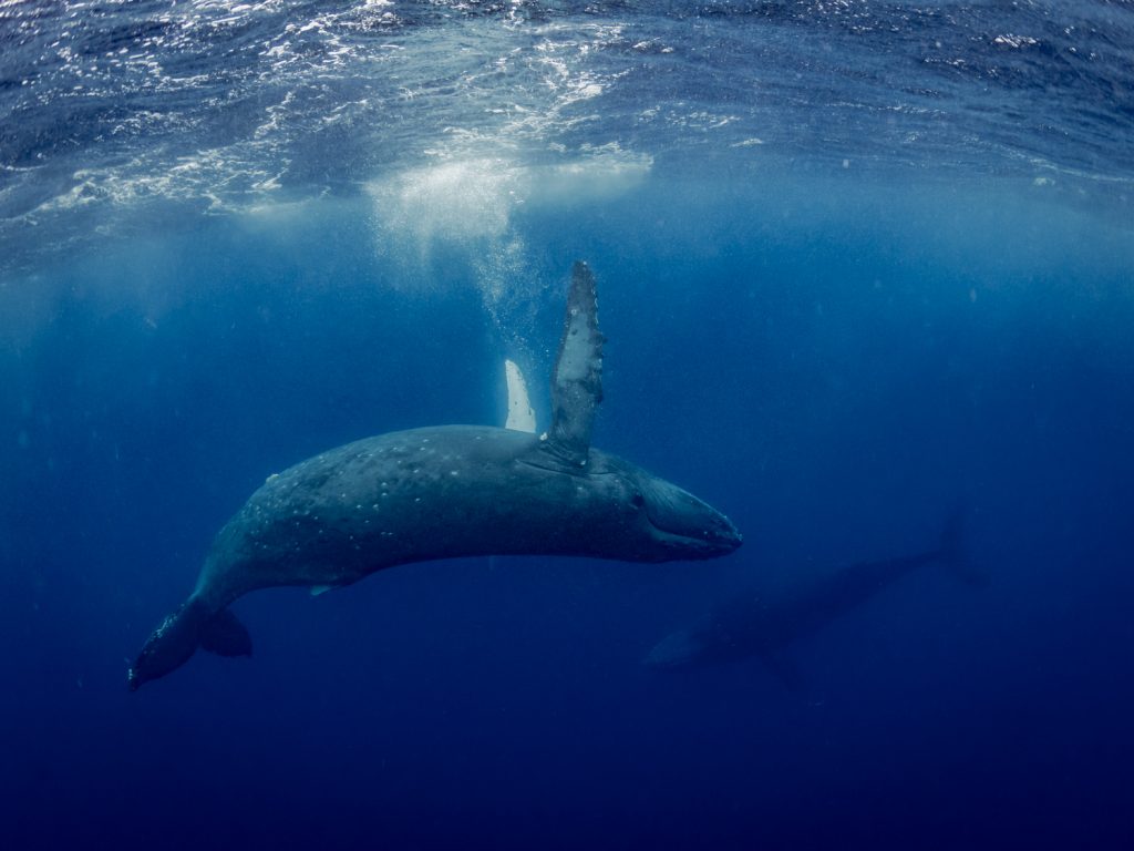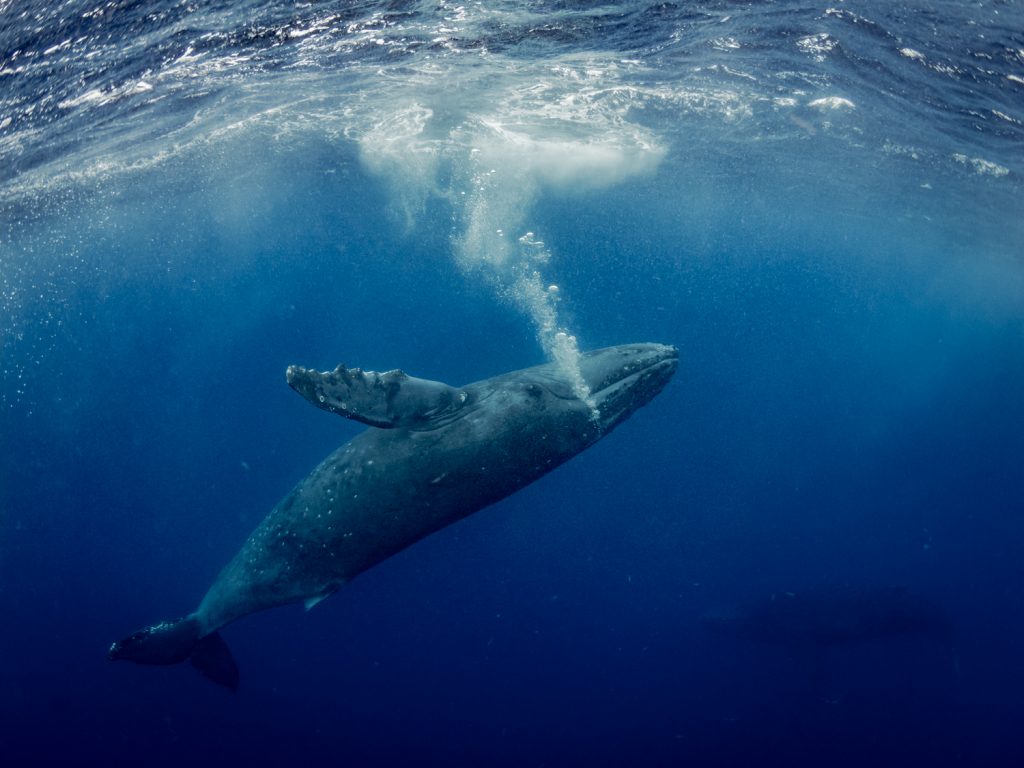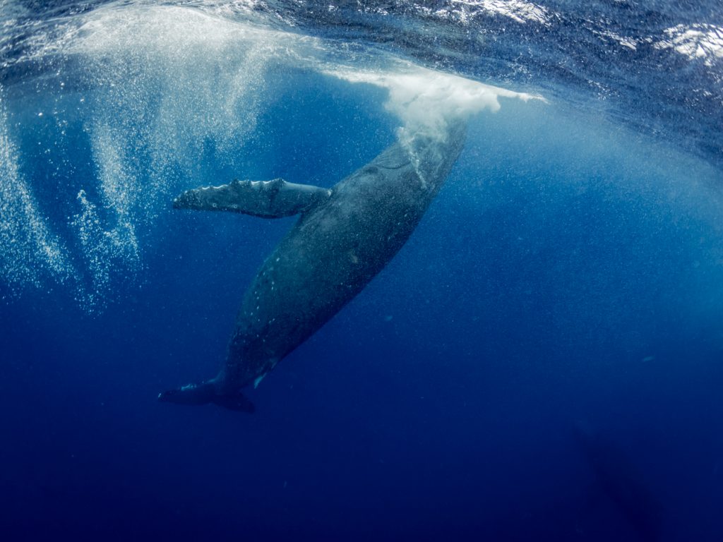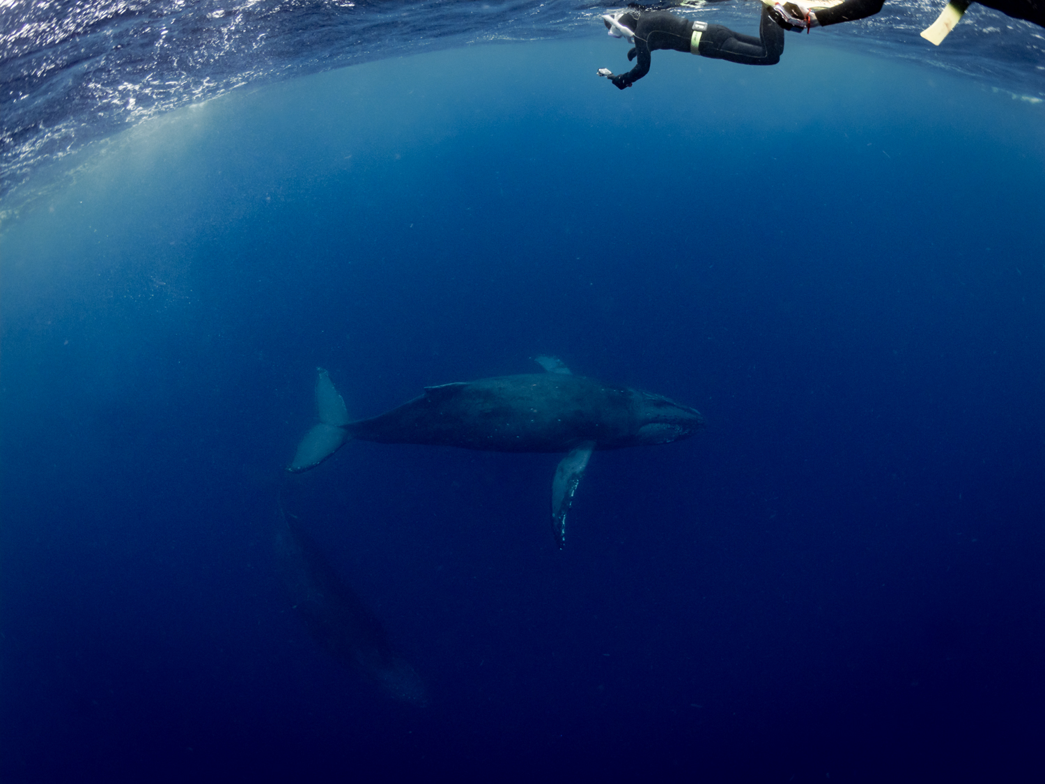 水中ではゆっくり真下を通ったり、泡を吐きながら通ったと思ったら、そのまま近くでスパイホップして、ゆっくり潜っていきました笑